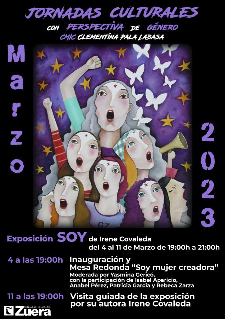 Este sábado, 4 de marzo, estoy invitada a participar en la mesa redonda «Soy mujer creadora», organizada por la Concejalía de Cultura del Ayuntamiento de Zuera dentro del marco de sus Jornadas culturales con perspectiva de género. Este encuentro tendrá lugar tras la inauguración de la exposición «Soy» de la pintora Irene Covaleda, quien ofrecerá una visita guiada el próximo sábado, 11 de marzo.